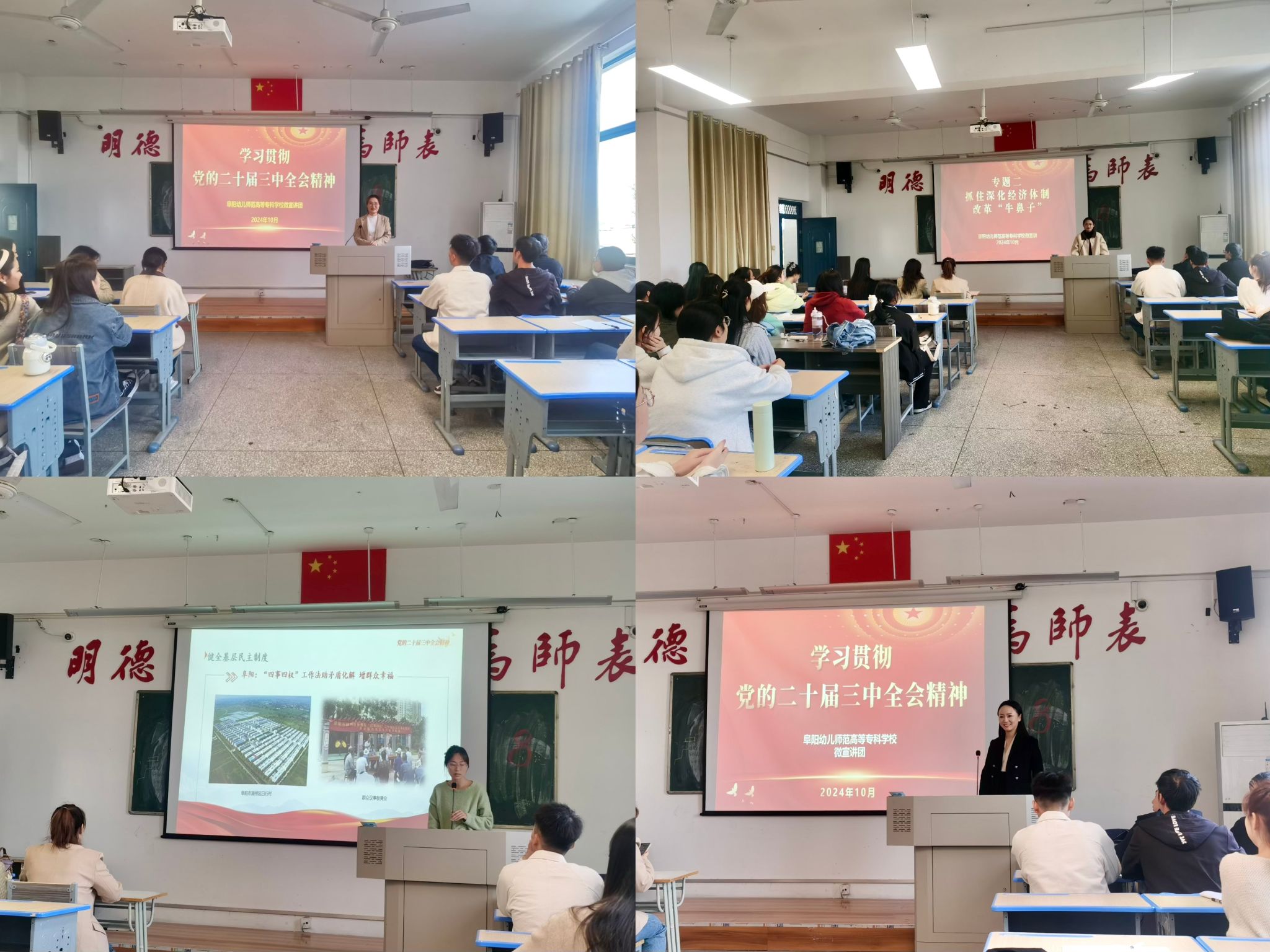 10月25日下午,宣讲走进学前教育学院开展宣讲活动。第一宣讲成员面向学前教育学院全体师生,深入浅出地阐述了党的二十届三中全会的重要内容,结合安徽阜阳发展现状、结合学校教学管理实际、依据个人经历及学生成长情况,对全会精神进行阐释讲解。宣讲组成员强调了进一步全面深化改革的重要性,并鼓励学生们将全会精神与日常学习生活相结合,积极投身于实践。