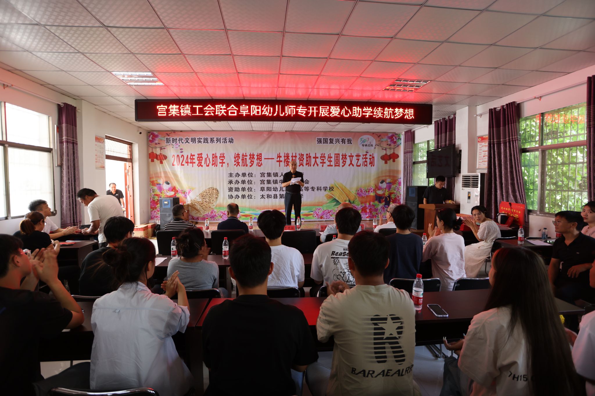 9月3日,学校在太和县宫集镇牛楼村举行资助大学生圆梦文艺演出活动。校党委副书记于华献为资助活动致辞,校党委委员、办公室主任徐常恺,宫集镇镇长马鹏飞,以及100多位学生和家长参加了活动。