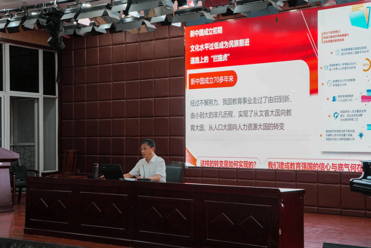课上,汤志从新中国教育发展主要历程、以教育强国建设支撑引领中国式现代化、向建成教育强国目标扎实迈进三个方面,借用一个个鲜活的事例、一个个精确的数据、一项项发展成果向同学们讲述了中国教育发展的光辉历程,振奋人心,鼓舞斗志。