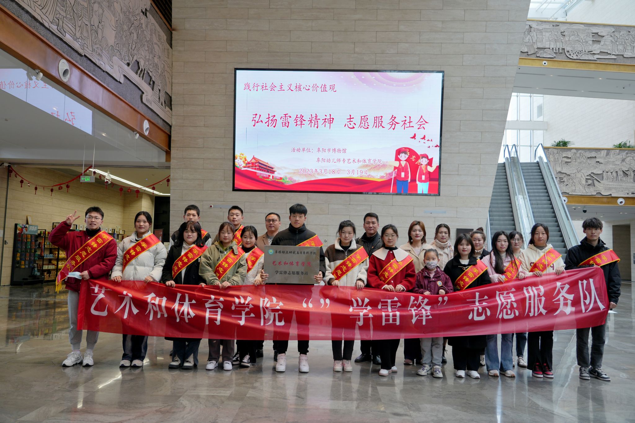 为学习贯彻落实习近平总书记重要指示精神,进一步传承和弘扬雷锋精神,推动学雷锋志愿服务制度化常态化长效化,结合我院专业优势,厚植青年学子热爱奉献意志,全面推进立德树人工作任务。3月18日上午,艺术和体育学院团总支组织“学雷锋”志愿服务队到阜阳市博物馆开展志愿服务活动,活动期间举行了授牌仪式,阜阳市博物馆副馆长杨玉彬亲自接待,艺术和体育学院党总支负责人范云峰、团总支书记周振国、教学秘书张希以及带队老师和14名志愿者参加。