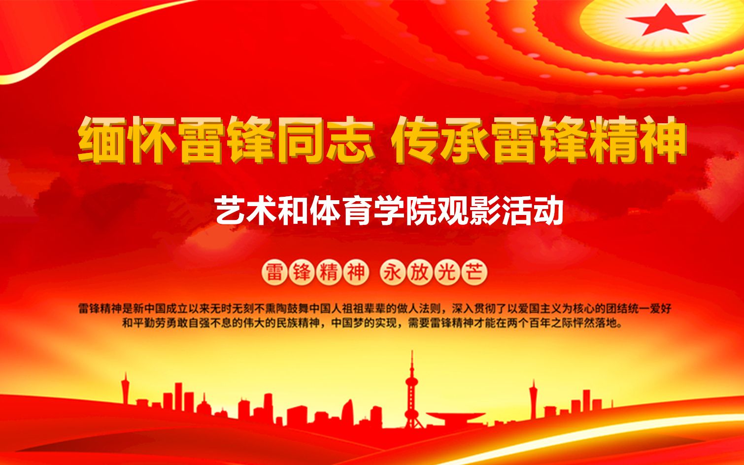 为缅怀雷锋同志,弘扬雷锋精神,倡导大学生积极投身学雷锋志愿服务,通过身边的事情献出自己对于回馈社会的一份力量,让志愿服务成为一种日常习惯,坚持“从我做起,从身边的小事做起”。使雷锋精神贯穿于日常生活的点滴细微之处,使学生养成良好的行为习惯,进一步推进我院的精神文明建设,特组织开展学雷锋观影活动。