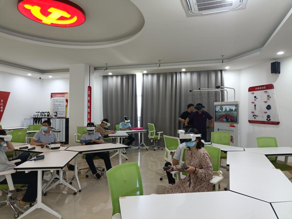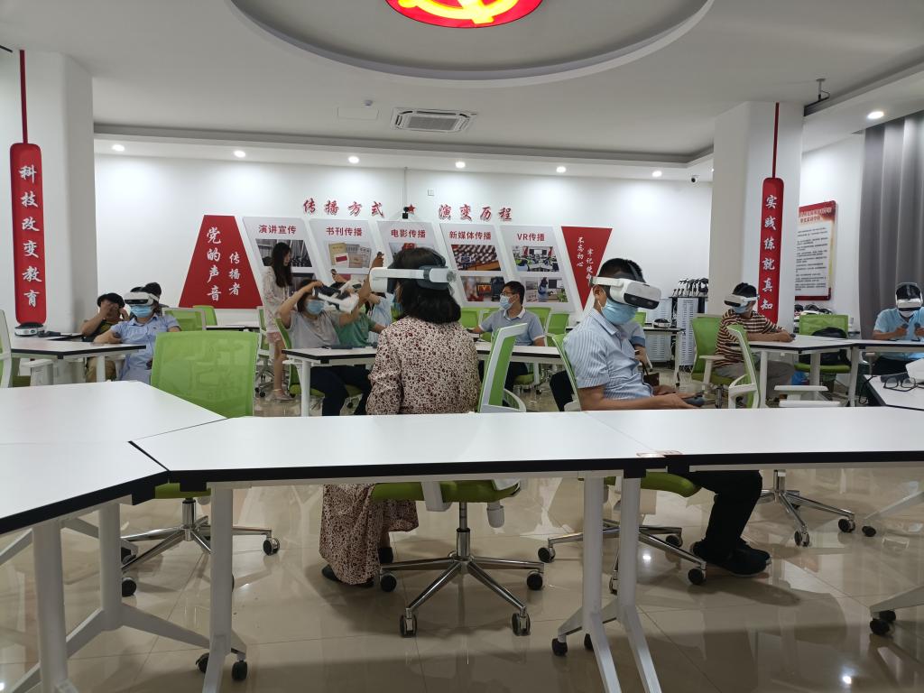 汪侠一行参观了百年党史长廊、新时代传习所、红色影院、中国精神VR体验台、初心问答、思政展厅、影音学习角、AR互动体验区、“印说党史”师生篆刻展等展厅和活动区域,体验了我校自主研发的“VR王家坝抗洪救援”、“VR红军爬雪山”等虚拟仿真思政课程。
